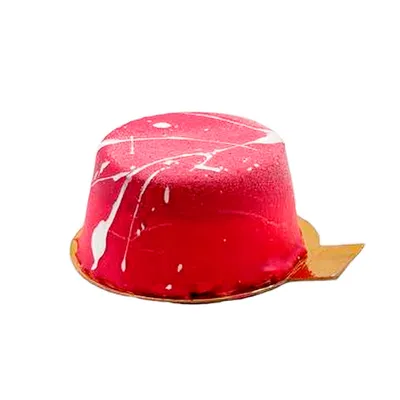 Муссово-ягодное пирожное на хрустящей основе из вафельной крошки и белого шоколада покрытое зеркальной глазурью. Прослойка из черной смородины.